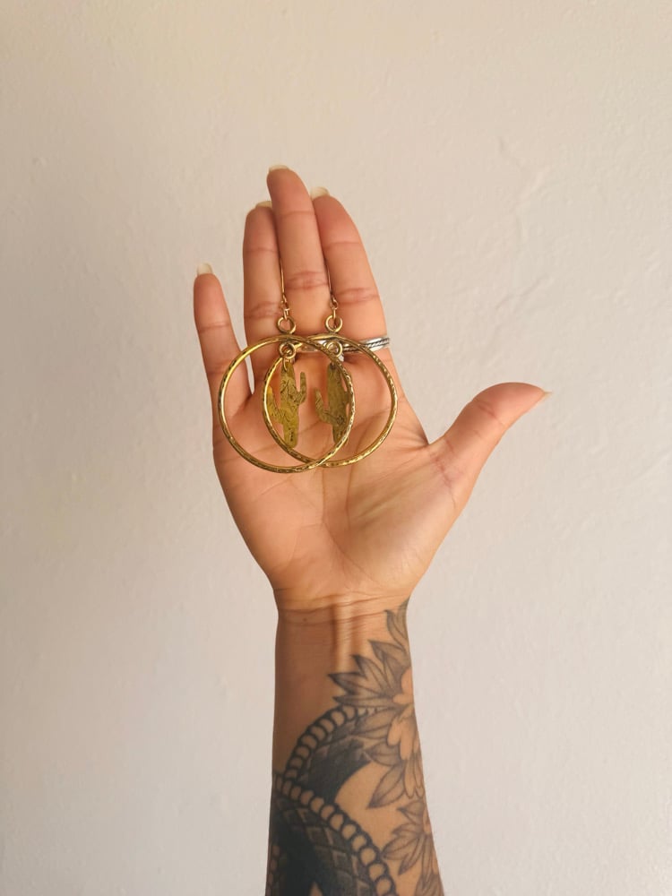Brass custom hoops with brass hand cut out friendly cactus. Light weight, ready to wear!