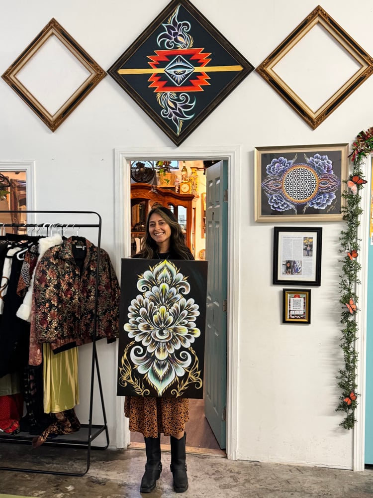 Size of this print is 36x20. If you would like another size, send me a message and we can make that happen. I embellish every piece to make them different from one another. Custom colors are available or my favorite my own creative expression.
