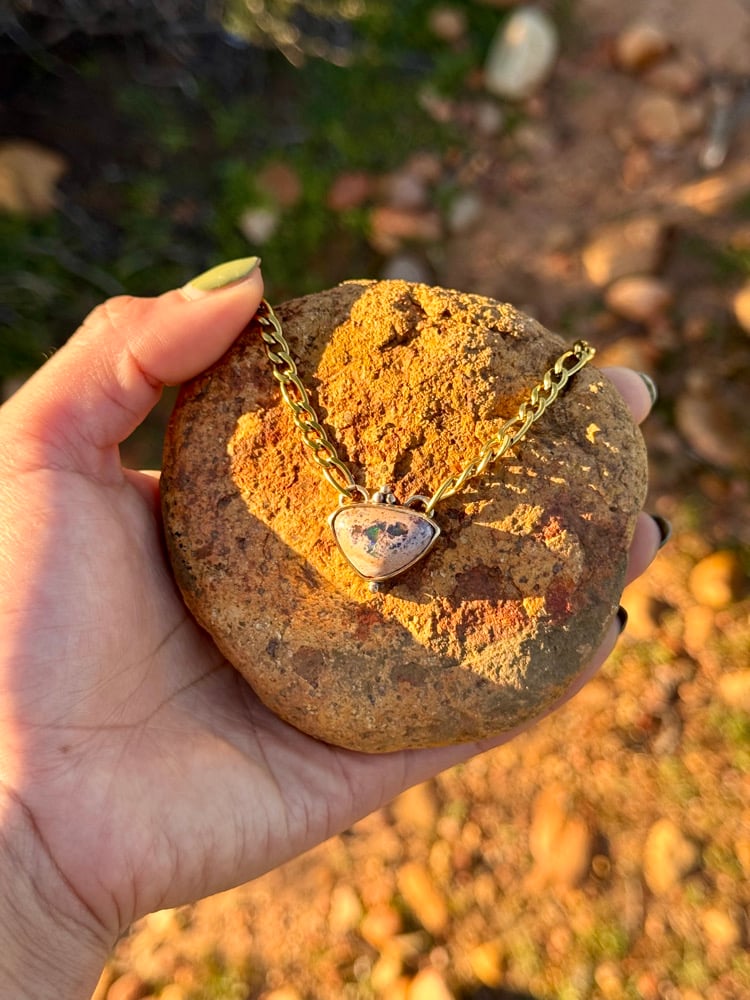 Green flash Opal stone picked up from a local lapidary artist from Sayulita Mexico. I love that this stone has a been a on journey with me and got to travel back to San Diego to make into a necklace. Pendant is wrapped in jewelers brass with a waterproof chain, known to last for 2 years if worn in the shower everyday and to last longer if not in water.