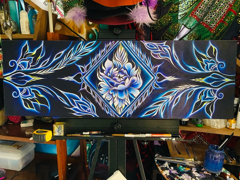 "Lakshmi" is named after my soul sister. Lakshmi in Hindu means goddess of beauty and fortune. My sister helped me really bring this painting to life, we talked for hours on the phone talking about life. Made time go by that it felt like a mindless doodle, meditation at its best. One of my favorite paintings and can say I'm proud of myself when I look at this painting.