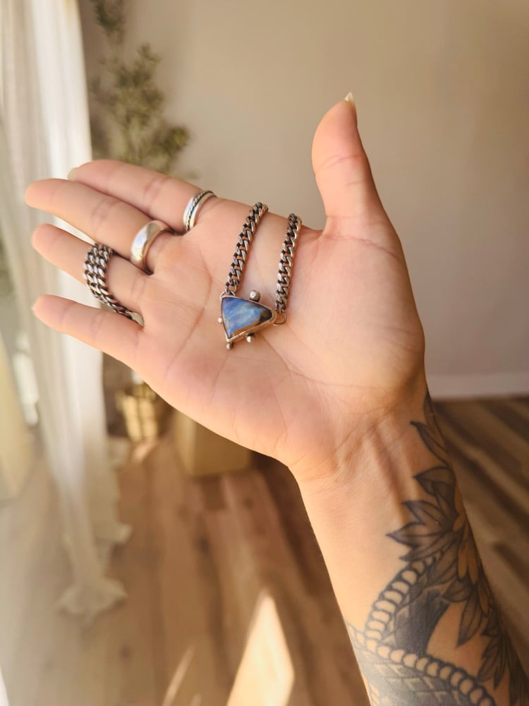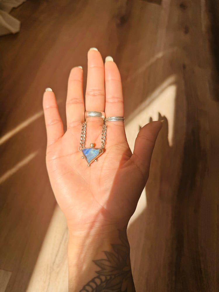 This opal has been hiding in the collection from before I started silversmithing, wishing that one day I could create something with it. That wish has come true, paired with a beautiful 20'' sterling silver chain. Perfect for layering or just one statement piece. Opals this shape don't come around everyday, she's a little baddie.