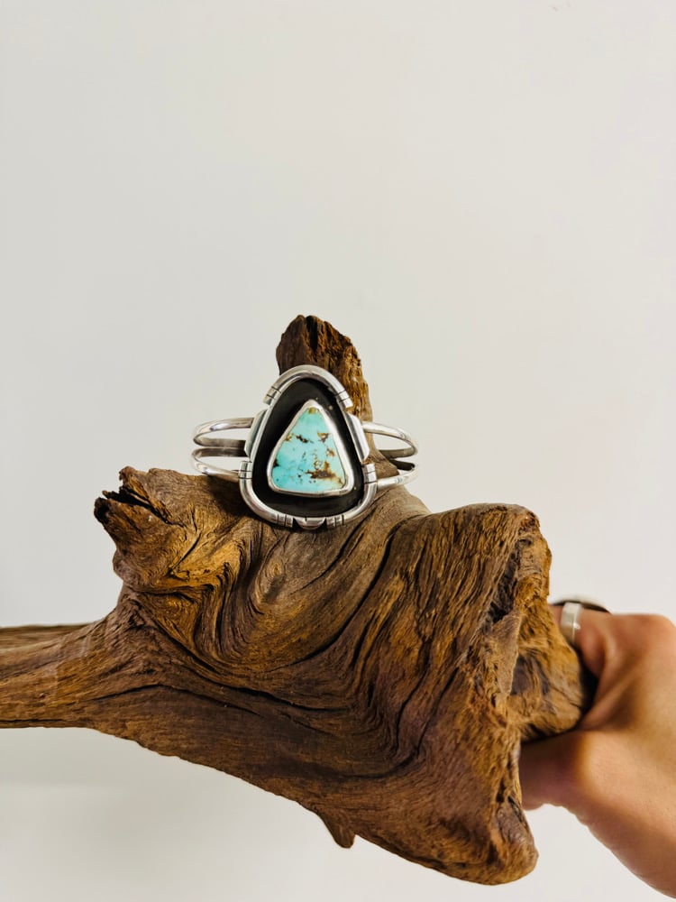 Inspired by Native American jewelers. Special sterling silver cuff made with loves of patience and seeing the vision from the start. Proud of myself for with one as it gave me a vision on my own style of jewelry making. Cuff is adjustable and comfortable to wear.