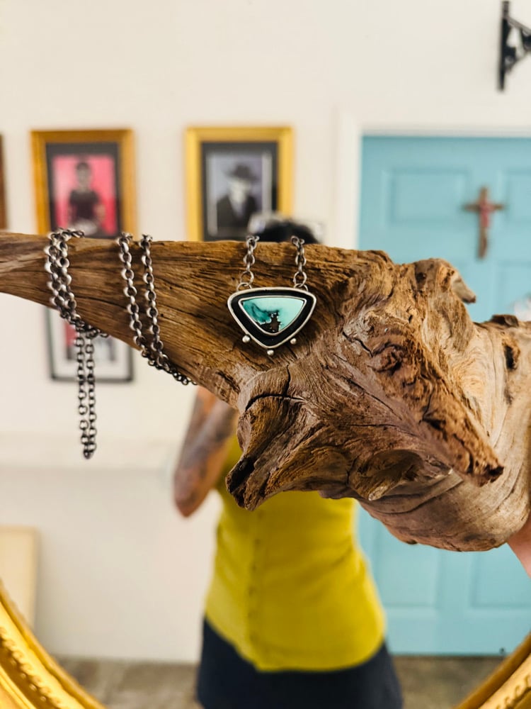 Inspired by Native American jewelers. Had fun finding the stone at a local market and met the person who mined and cut the stone. A real treasure hunt is always fun. Sterling silver necklace is 30'' long.